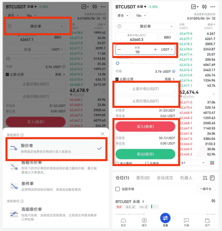- 在 “合约” 界面选择 “限价委托” 或 “市价委托”;