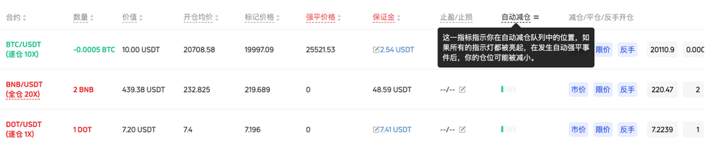 此处显示该仓位的自动减仓队列信息,发生自动减仓时,仓位内自动减仓排名最高的仓位将优先触发自动减仓。自动减仓排名根据仓位的盈亏和使用的有效杠杆而定。