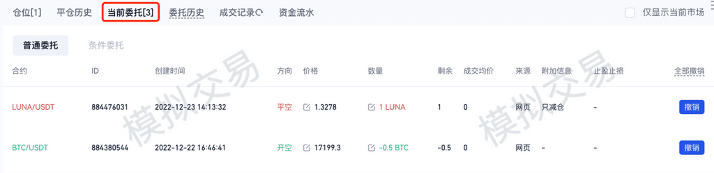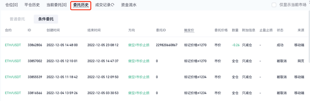 包括已取消、全部成交和部分成交的委托。此处可详细查看结束时间、方向、委托价格、数量、成交均价、结束原因以及来源等信息。