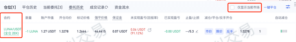 此处显示用户所有市场的交易对。如果用户持有多个市场的不同交易对,可选择“仅显示当前市场”,在同一页查看当前市场的交易对详情。
