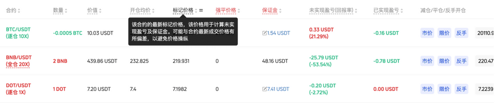 未实现盈亏显示持仓的实时未实现盈亏。默认模式下,持仓区未实现盈亏根据标记价格计算。然而,当用户将光标移至未实现盈亏时,会显示根据最新成交价计算得出的数字。Gate使用标记价格触发强制平仓,方便用户高效评估亏损空间,防止遭到强制平仓。