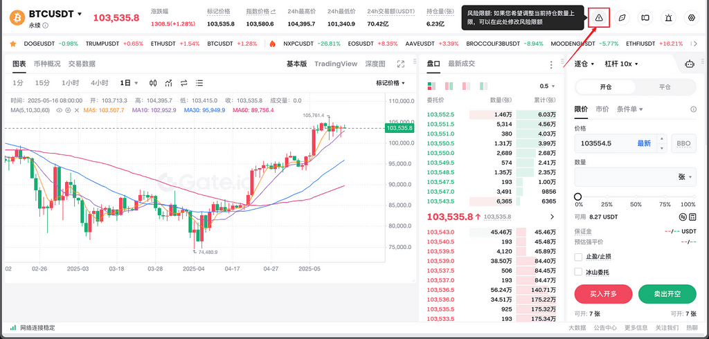 本文将为您详细介绍Gate永续合约交易页面的操作,包括持仓区的各项功能、合约、数量、价值、开仓均价、标记价格、强平价格、保证金、未实现盈亏、已实现盈亏等重要指标的含义与计算方式,用户可以通过持仓区查看自己的交易对详情,了解当前的盈亏状况及风险,此外,系统还提供减仓、平仓、止盈止损等操作功能,方便用户灵活管理仓位,用户还可以设置保证金模式和杠杆倍数,自定义交易设置,使用计算器进行盈亏预估,调整风险限额,切换交易图表模式,所有功能旨在提升用户交易体验和风险控制能力,如需更深入的信息和操作指导,请参考Gate提供的相关文档和教程。