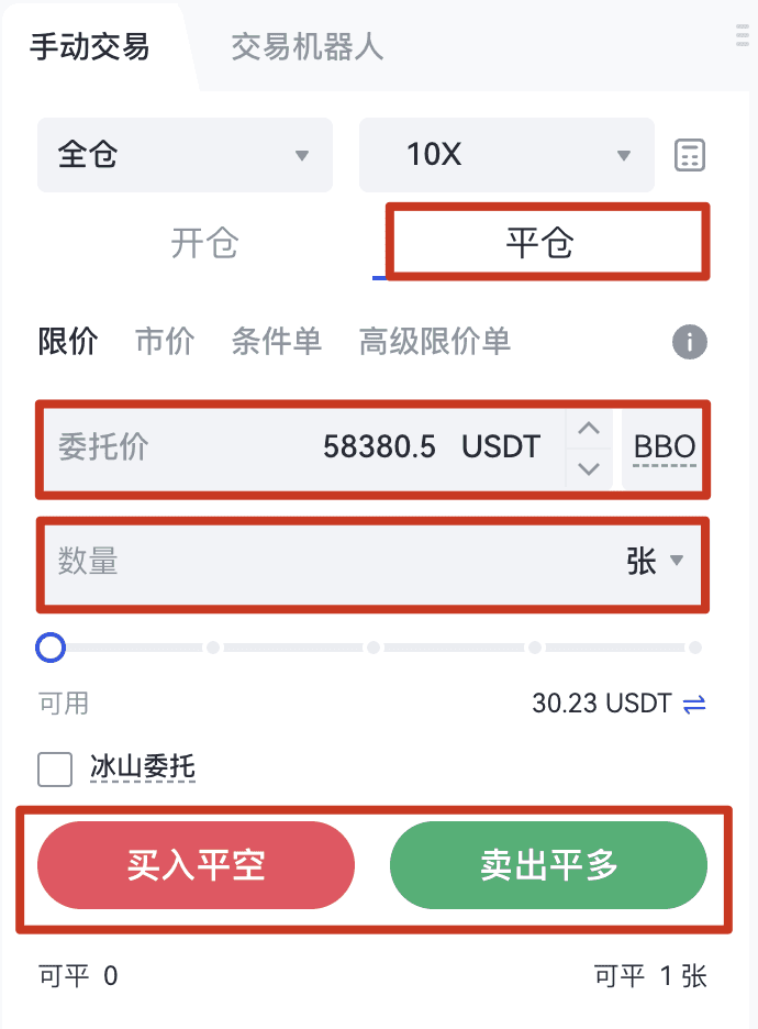 在 “仓位” 列表的下方选择限价/市价。如果选择 “限价” ,需输入价格和数量进行平仓;如果选择 “市价”,无需输入价格,即可快速平仓。