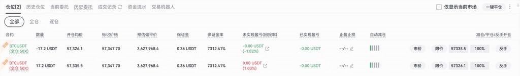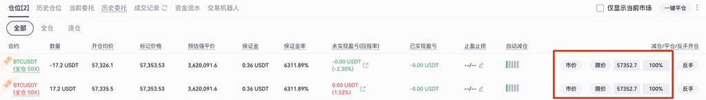 在“仓位”中,查看当前的多头和空头仓位,包括每个仓位的数量、杠杆、保证金信息等。 - 平仓操作: