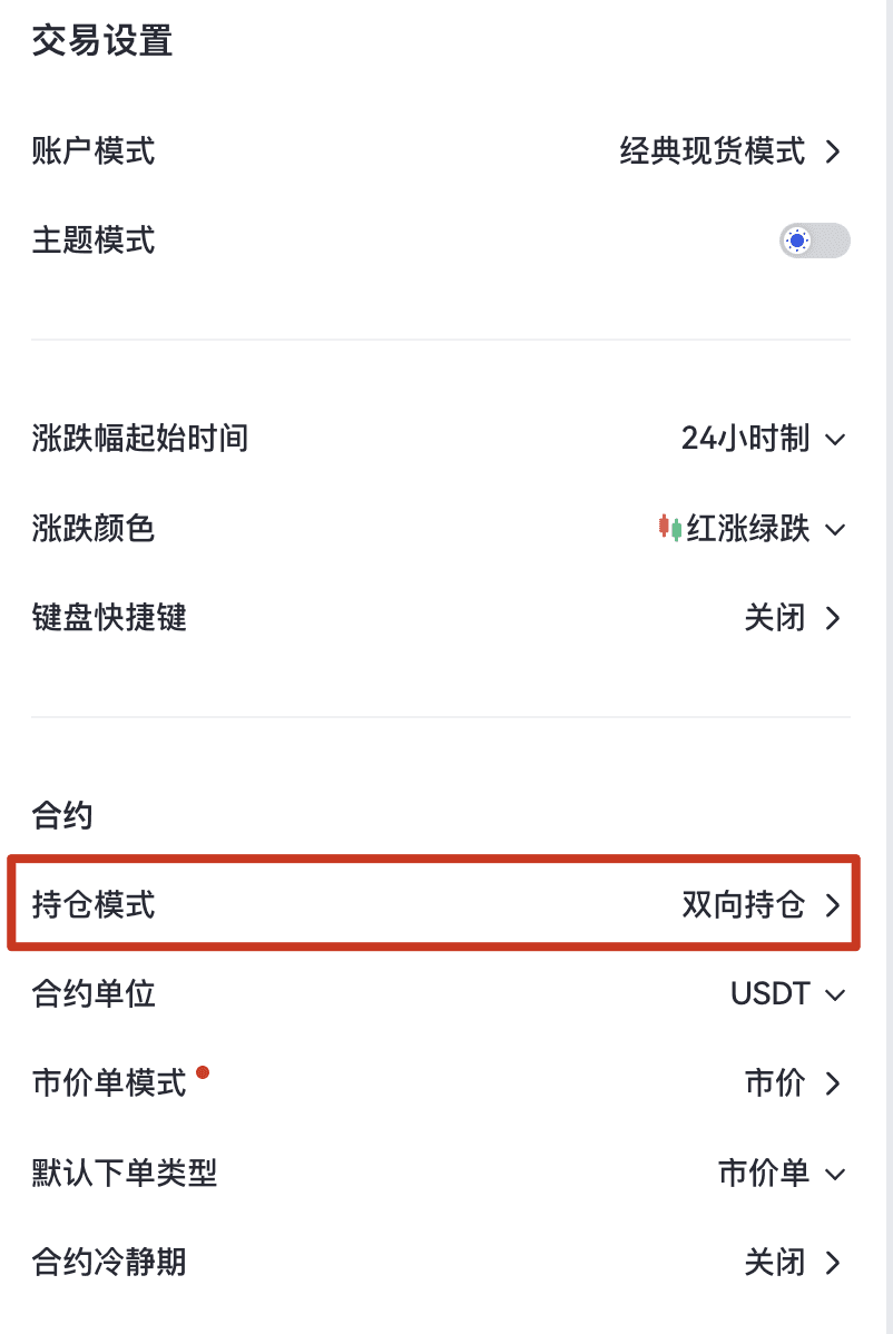 在【交易设置】—【合约】中找到“持仓模式”选项。