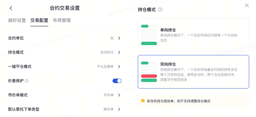 在【交易配置】点击“持仓模式”,选择“双向持仓”。请注意,切换持仓模式前,应先检查持仓和挂单状态,确认当前没有未平仓的合约和挂单。如果有,需要先平仓或取消挂单。- 设置仓位: