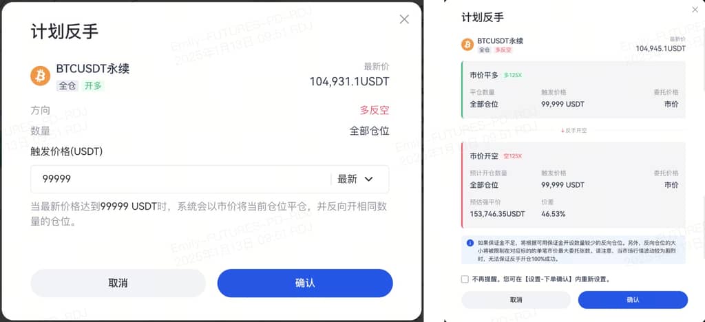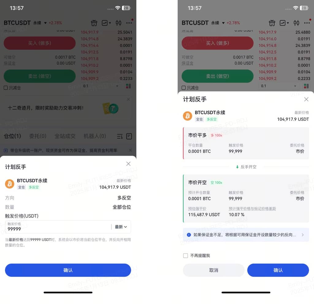 计划反手:市价反手的进阶版功能,您可以提前预设自动执行仓位反手的价格,当价格达到触发条件时,仓位会以当前价格执行市价反手操作,即先以当前市价平掉已有仓位,同时取消未成交的挂单,再根据原仓位的数量和杠杆,在当前市价下反方向重新开仓。