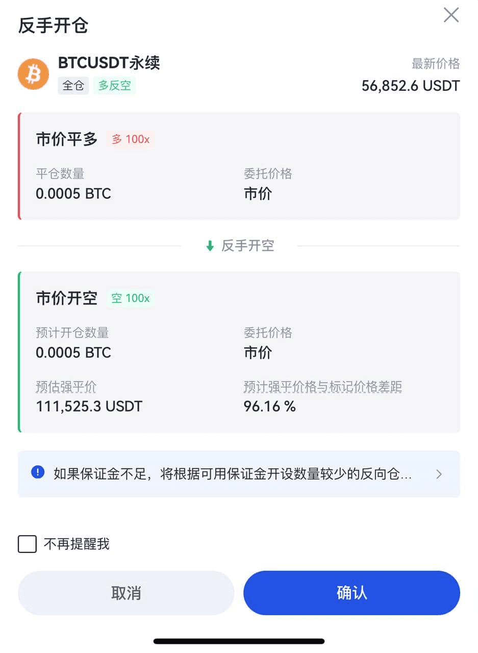 核实弹窗内信息:当前合约交易对、反手开仓方向、委托价格、委托数量等