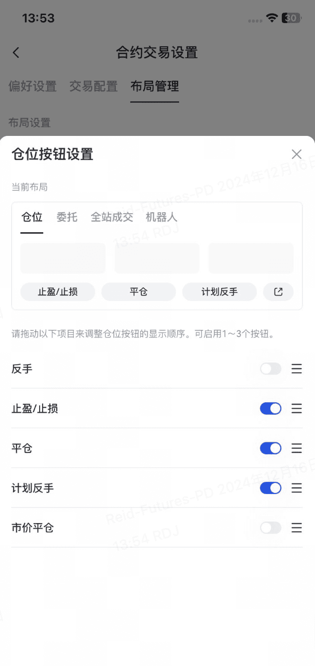 - 在合约交易设置 - 布局管理 - 仓位按钮设置中,打开计划反手按钮开关;
