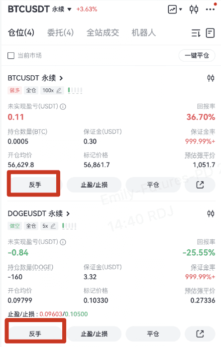- 在合约 “仓位” 处右侧可以看到 “反手” 按钮