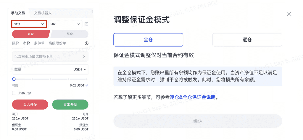 - 全仓模式: 在全仓模式下,账户中的所有余额都可作为保证金使用。如果账户净值不足以维持保证金要求,系统将触发强制平仓,此时您可能会损失账户中的全部余额。适合有经验的交易者,能够灵活调配资金,提高资金利用率。