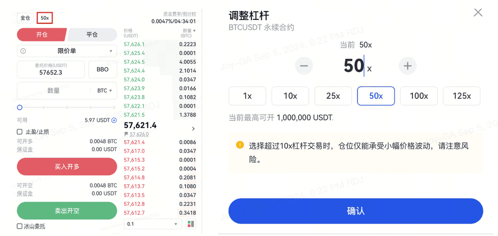 - 点击如图所示“杠杆倍数”选框,在【杠杆调整】弹窗输入所需的杠杆倍数或从选项中直接选择杠杆倍数。确认无误后,点击“确认”。