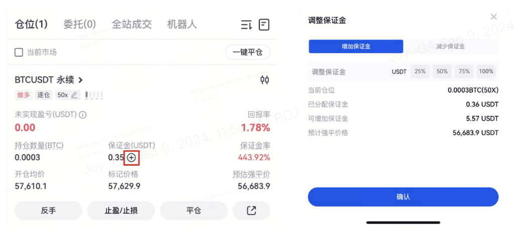 您可以在【仓位】页面点击【添加】图标,在【调整保证金】弹框中输入您想增加或减少的保证金金额,然后点击“确定”。