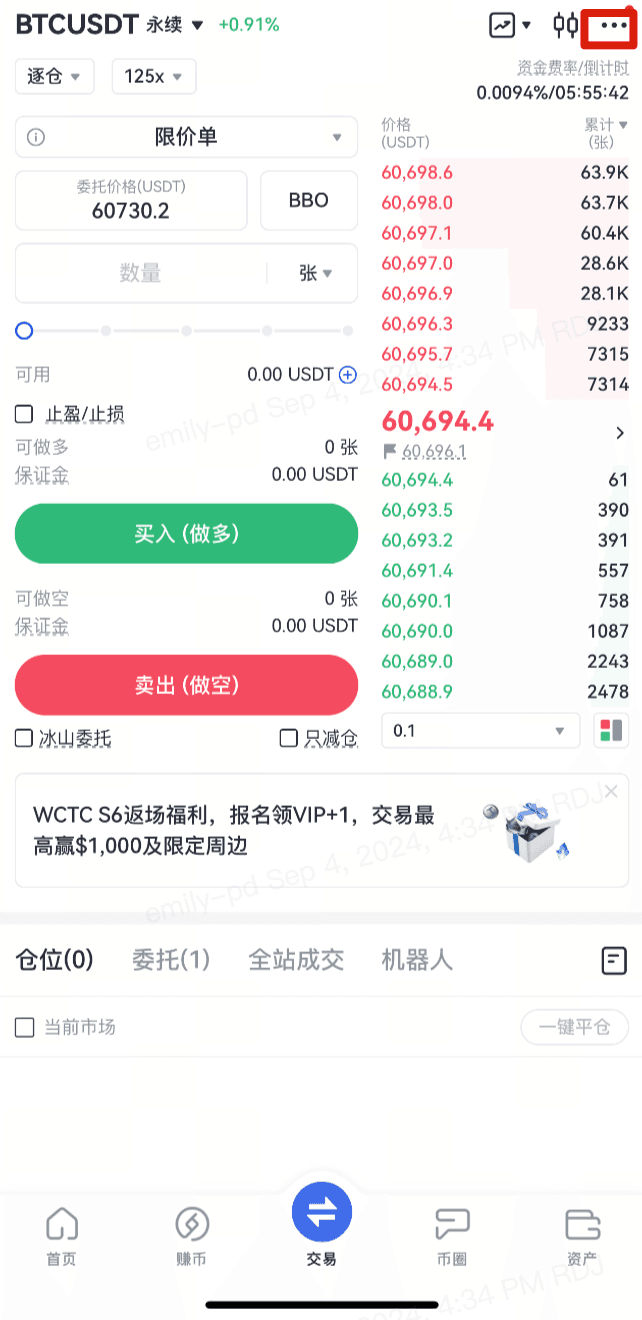 - 进入【合约】页面,点击右上角的【交易设置】。
