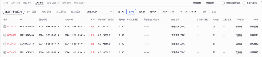 已完成或已撤销的分段委托子订单都会进入【委托历史】中,可以查看委托历史记录。可在【历史委托-限价|市价委托】列表中查看分段委托的订单信息;