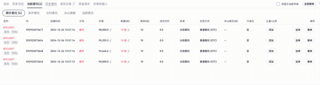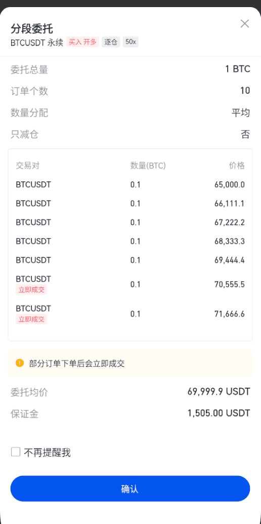 分段委托是一种适用于所有永续合约交易(包括USDT本位和BTC本位)的高级下单方式,用户可以设置特定的价格区间,并在该区间内一次性下单多笔限价委托,支持的订单个数范围为2-10,用户可选择平均、递增或递减的数量分配方式,市价波动时,分段买入会依次触发低价订单,分段卖出则会触发高价订单,帮助用户在开仓或平仓时获得更优均价,分段委托操作简单,用户只需在交易界面选择分段委托,输入相关参数并确认即可,成功挂单后可在当前委托中查看,已成交或撤销的订单可在委托历史中查询,分段委托为用户提供了更灵活的交易策略,尤其适合市场波动较大的情况下使用。
