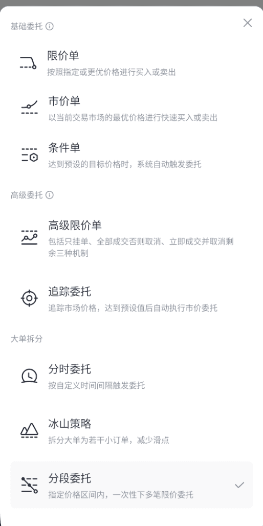 请注意,如果当前市价优于子订单价格,在分段委托预览中立即成交的子订单会有“立即成交”标识。