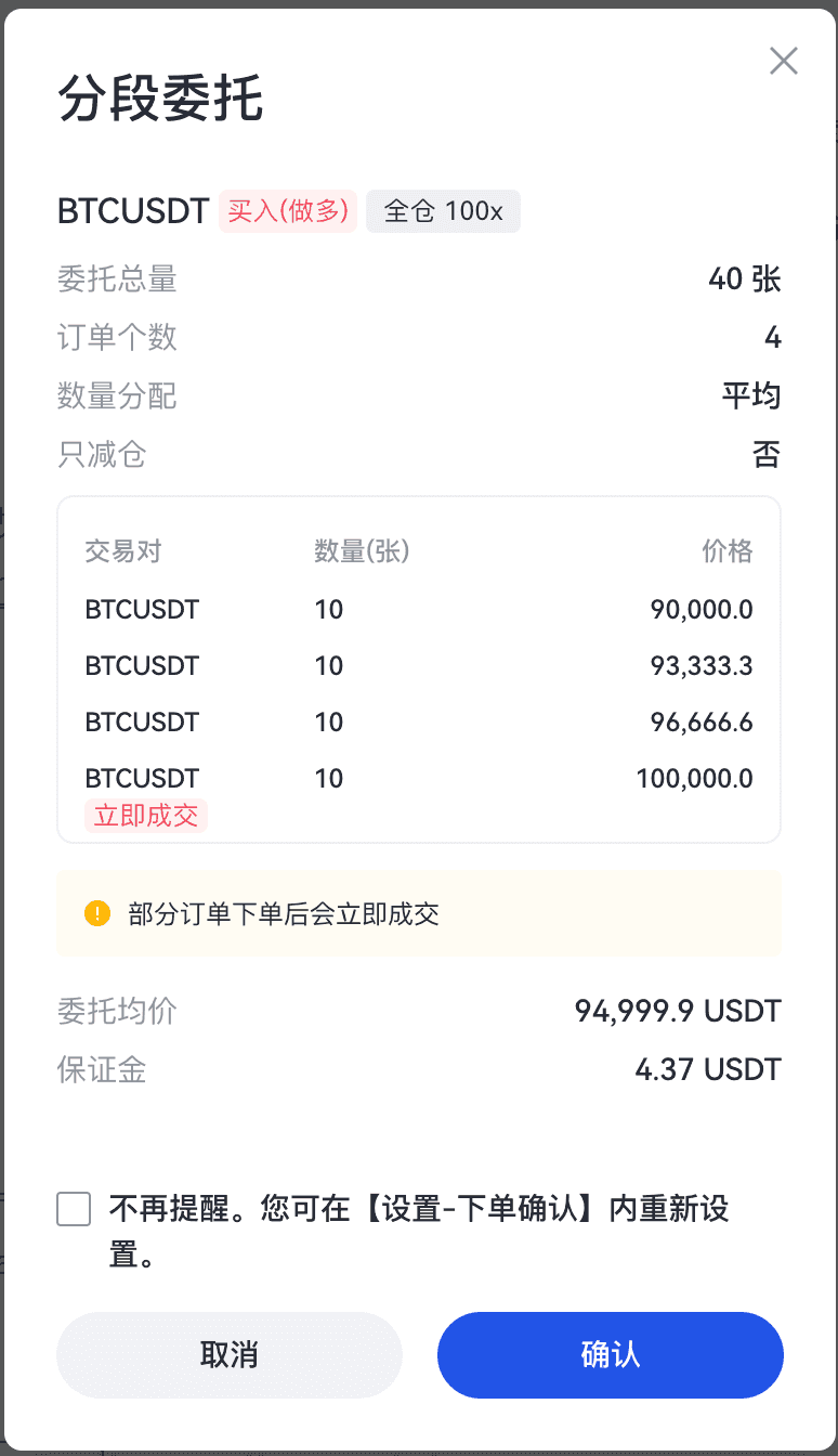 分段委托适用于所有永续合约交易(包括USDT本位和BTC本位)。分段委托支持用户设置指定的价格区间,并在此区间内按照指定的数量分配模式一次性下单多笔限价委托。