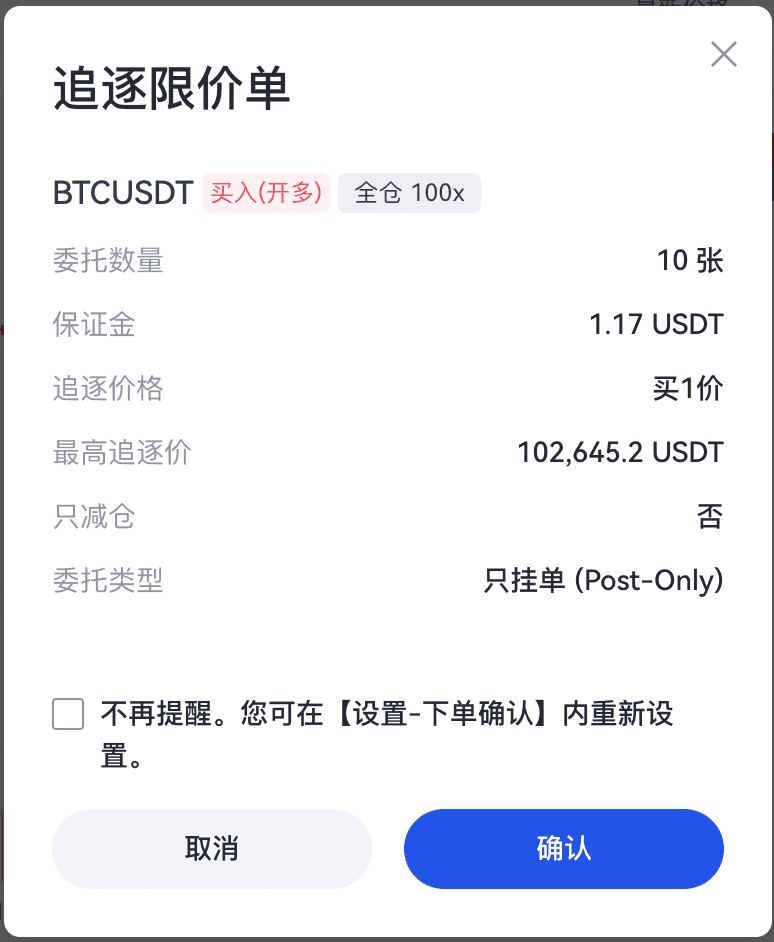 当成功提交后,系统会根据当前盘口买一价下1个BTC的限价委托单,当盘口买一价变化时,挂单中可成交的部分会进行成交,剩余未成交的数量会按照最新的盘口买一价进行挂单,不断循环直到成交数量达到1个BTC或者小明手动取消追逐限价单。