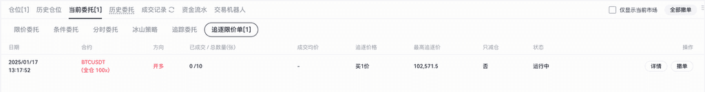 挂单成功后,可在交易页面下方的【当前委托】-【追逐限价单】中,查看当前运行中的订单,已经完全成交或撤销的订单可在【委托历史】中查看,已成交的部分可以进入追逐限价单详情页进行查看。