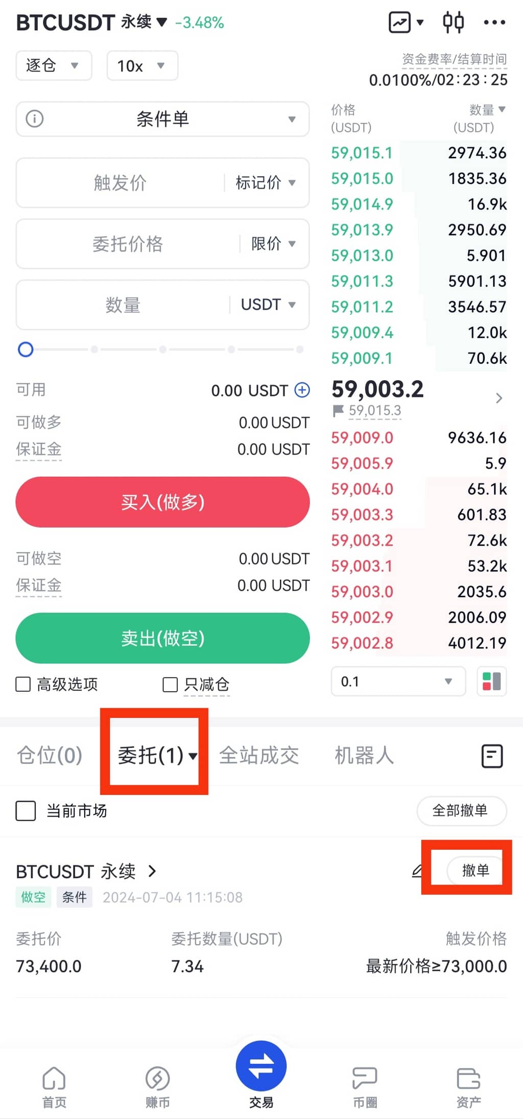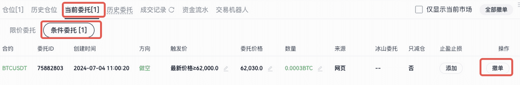 - 被触发后,系统检查预定委托的有效性,创建委托单并将其放入委托单列表。条件委托后即可设置计划开仓,也可计划平仓。【如果输入触发价大于最新价(标记价格)就是>=,输入触发价小于最新价(标记价格)就是<=】。