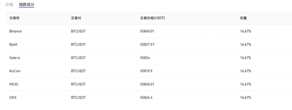 以BTC_USDT为例,该交易对指数价格来源于Binance,Bybit,Gate,OKX、KuCoin和MEXC六家交易所。