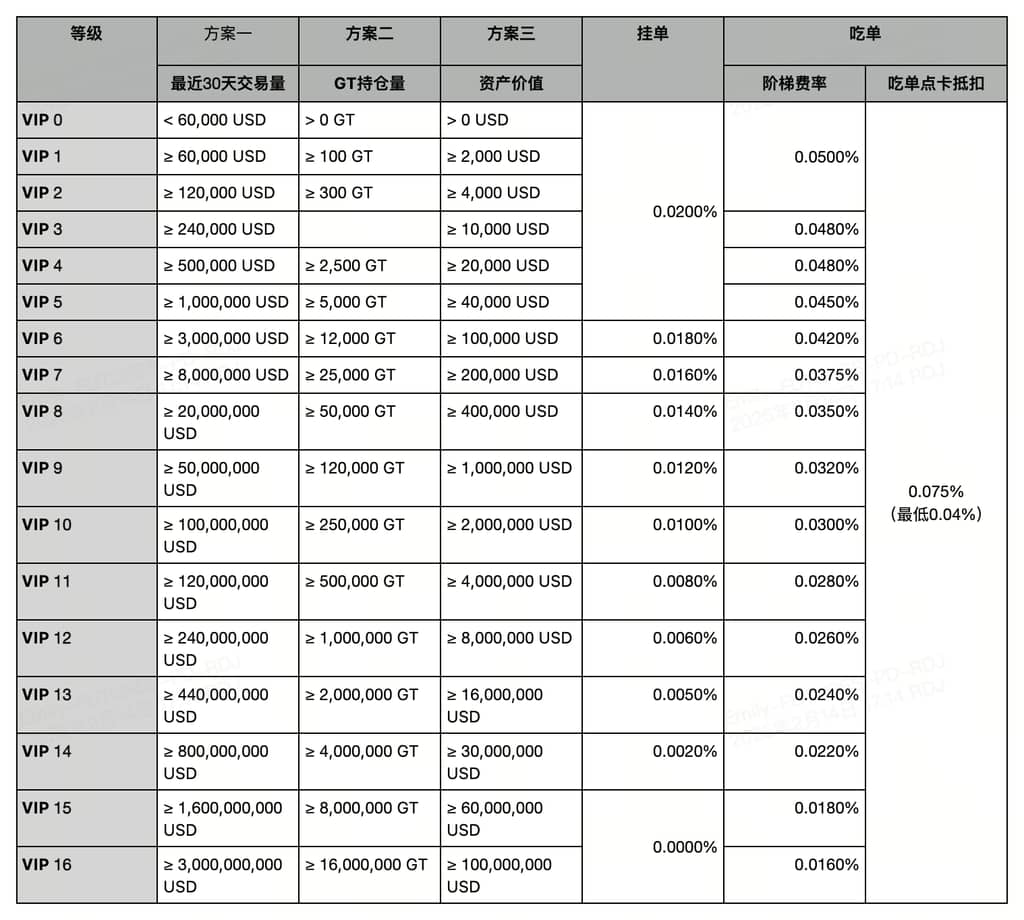 - 挂单手续费根据阶梯费率计算,吃单手续费用户可以选择是否使用点卡进行抵扣。若有点卡,则按固定费率 0.075% 扣除,最低综合费率可至 0.0225%;若无点卡,则按 VIP 等级对应的费率计算。