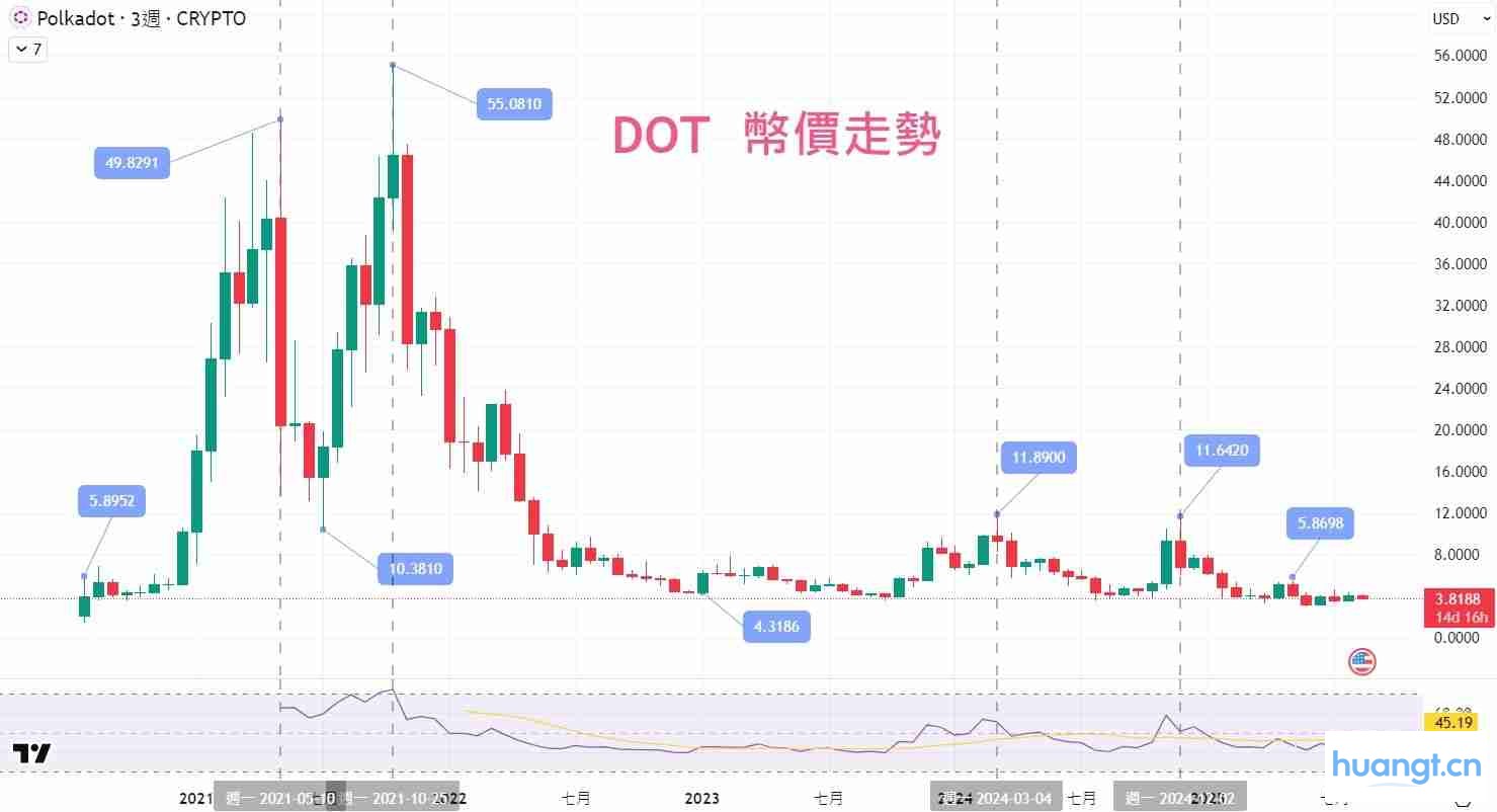 - 2025 年8 月现况整理:截至目前(2025 年8 月),DOT 币价约为3.81 美元,相较历史高点已回落超过90%,处于长期低档区间。市场普遍关注其在Polkadot 2.0 升级后,是否能带来新的资源弹性与生态活力,成为后续走势的关键观察点。