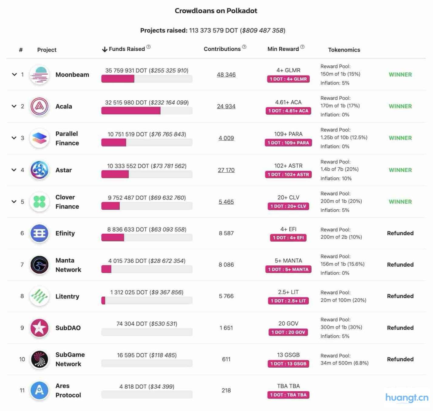 Polkadot 的首次插槽拍卖从2021 年11 月开始,前五档得主一共吸引了1.1 亿颗DOT 币参与,以当时币价约40 美元来计算,约为40 –50亿美元的规模。