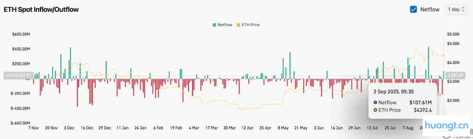 链上数据和资金流向强化了这种看涨基调。9月2日,约有1.076亿美元的ETH净流入交易所,创下数月来单日流入量之最,表明ETH已累计接近4,390美元。机构需求也大幅回升;8月底,约有14亿美元流入以太坊ETF,助推了近期的上涨。包括宽松货币政策和全球流动性增强在内的宏观因素,鼓励投资者重返加密货币市场。总而言之,以太坊的基本面依然稳固,使其在9月份测试关键阻力位之际,继续成为市场关注的焦点。