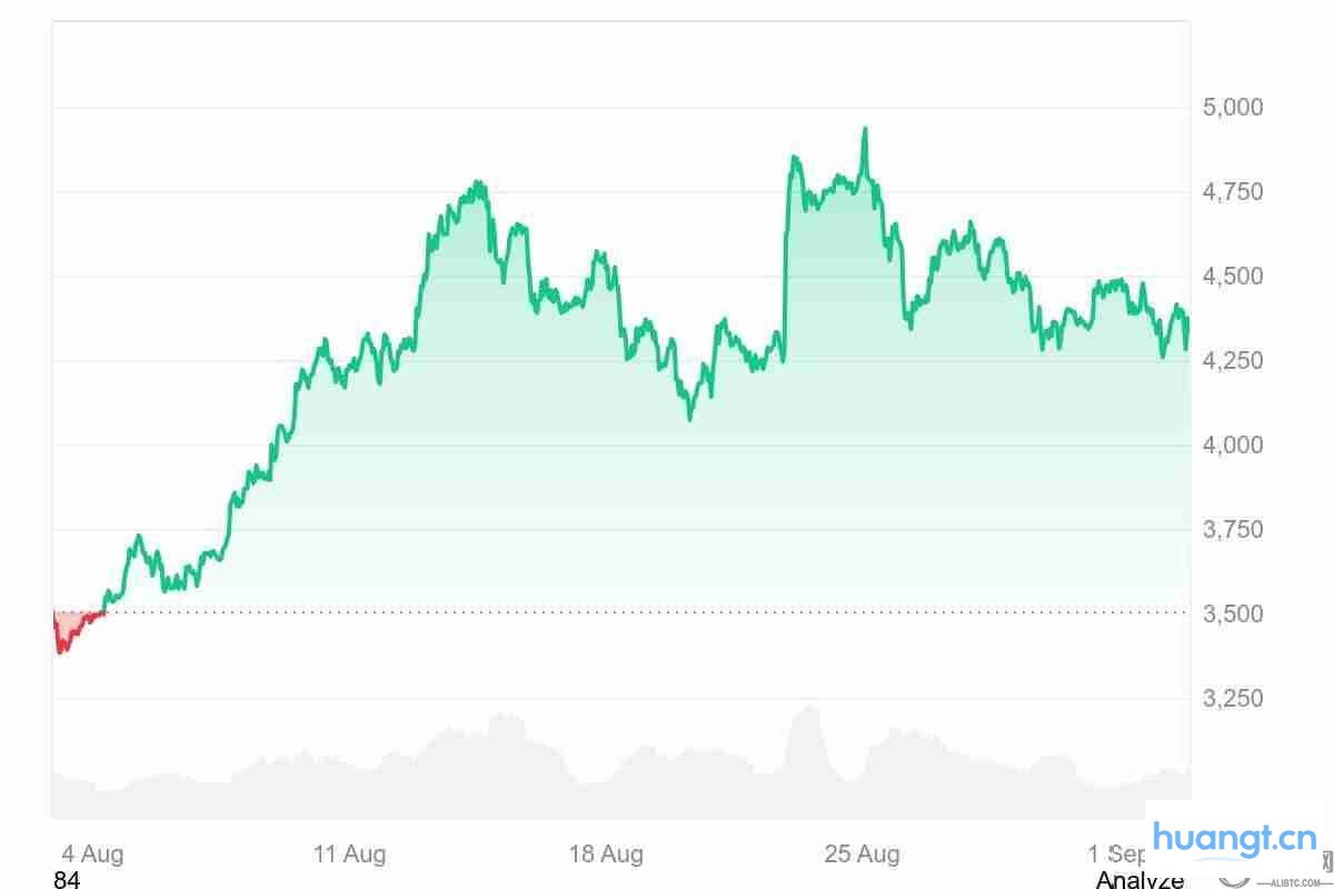 市场专家对以太坊今年9月的走势持谨慎乐观态度。短期预测显示,ETH可能达到4,650至4,850美元,中期区间为3,500至5,000美元,具体取决于关键阻力位是否被突破。一些分析师认为,如果ETF流入和交易量保持强劲,ETH有可能突破4,900至5,200美元区间。市场整体情绪偏向乐观,交易员指出,如果势头持续,ETH似乎有望呈现抛物线式上涨。