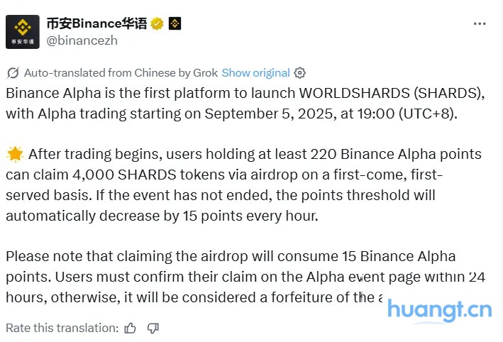 huangt 消息,币安 Alpha 是首个上线 WORLD SHARDS ( SHARDS )的平台,其 Alpha 交易将于 2025 年 9 月 5 日 19:00( UTC +8)开启。需注意,申领空投将消耗 15 个币安 Alpha 积分。用户需在 24 小时内于 Alpha 活动页面确认申领,否则将视为放弃该空投。