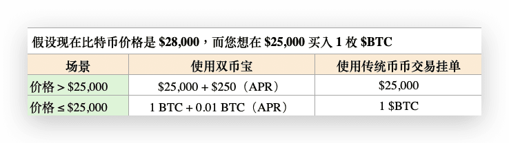 到期日当天的结算价格将会决定我们取回的币种,如果结算价格> $25,000 ,虽然抄底失败,但仍能获得$USDT 本位收益;若是结算价格≤ $25,000,则抄底成功,还能获得额外的$BTC 收益!