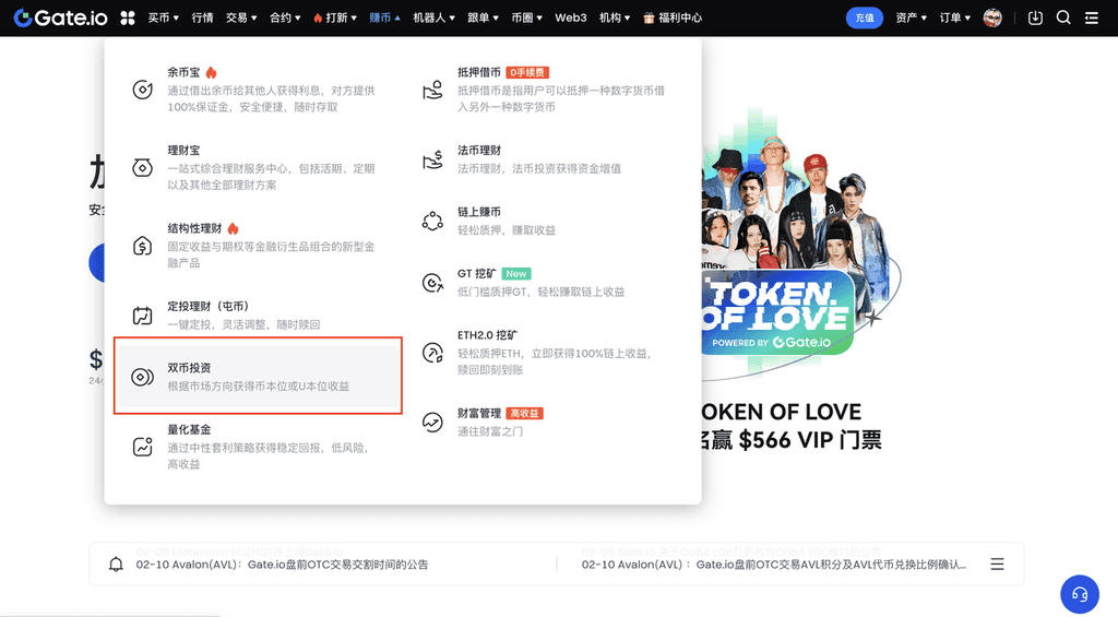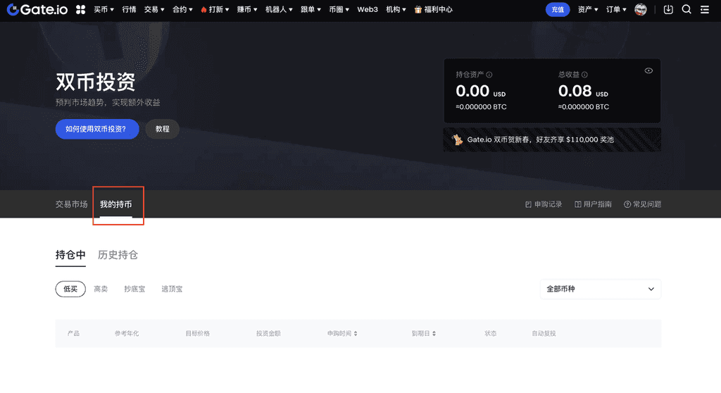 1、若您是 Gate 用户,选择登录 Gate 个人账户;若不是 Gate 用户,则可以先注册。点击导航栏【赚币】——【双币投资】,进入双币投资页面。