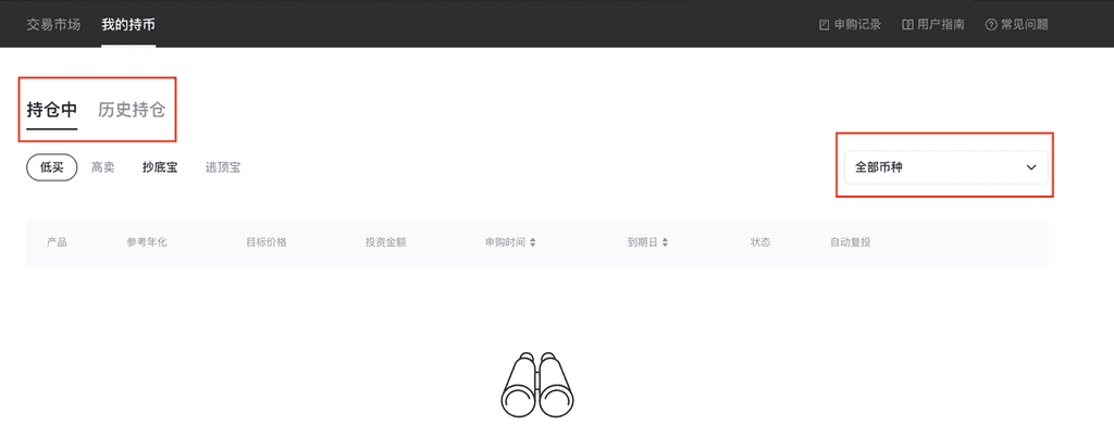 4、在“双币投资”页面点击【我的持币】可查看购买的产品信息列表。