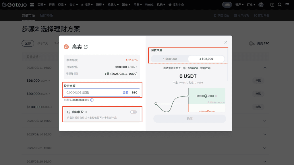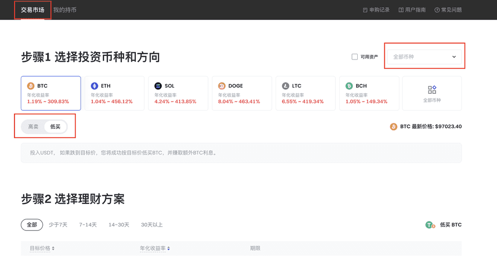 若您是 Gate 用户,请登录您的个人账户;若您还不是用户,您可以先进行注册,接着点击导航栏中的【赚币】选项,再选择【双币投资】以进入相关页面,随后在“交易市场”中选择或搜索您希望投资的币种,您可以选择“高卖”或“低买”进入购买页面,以 BTC 理财为例,您在“BTC版块”选择“高卖”,并根据“目标价格”、“年化收益率”、“期限”等信息进行产品选择,点击右侧的【申购】按钮,接着进入购买界面后,填写您的投资金额,您还可以选择是否开启“自动复投”,在页面右侧通过回款预测查看预计收益,确认信息无误后点击“确定”,在“双币投资”页面中点击【我的持币】可查看您的购买产品信息列表,您可以在“我的持币”界面查看当前持仓与历史持仓记录,并可根据币种和方向进行筛选,以上操作步骤简单明了,旨在帮助用户更好地进行双币投资。
