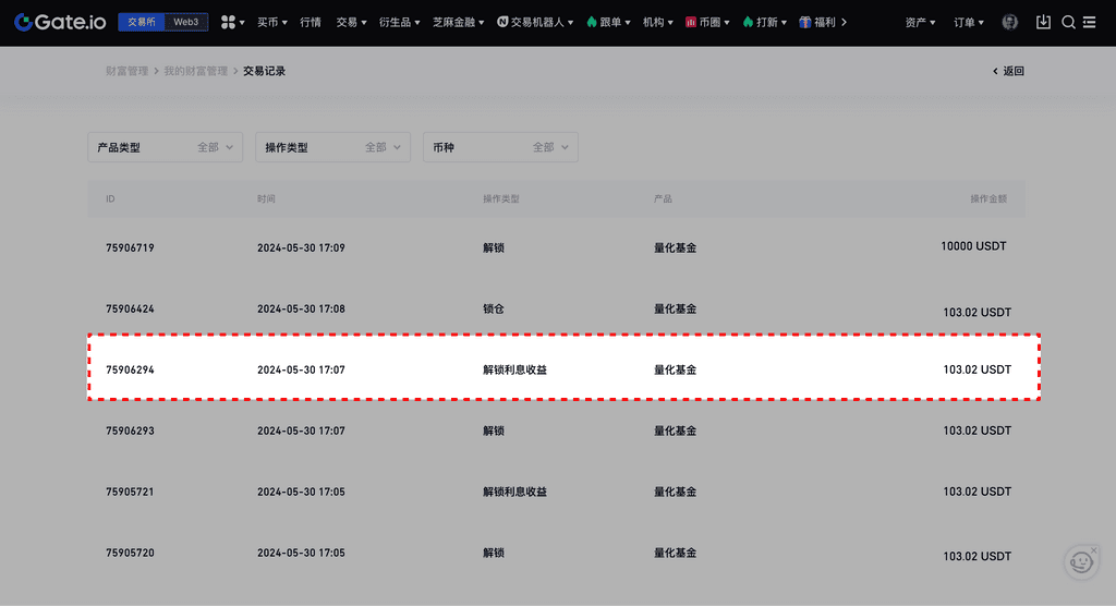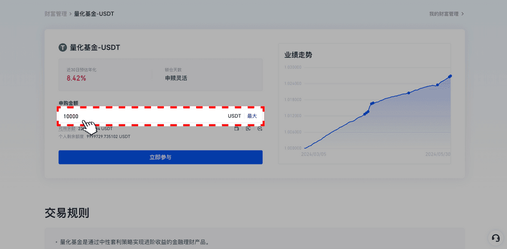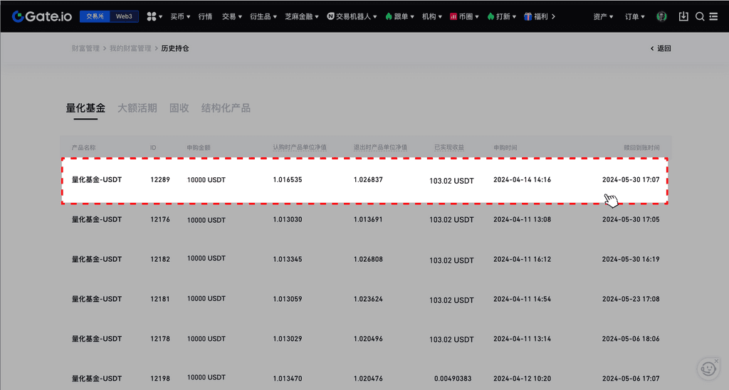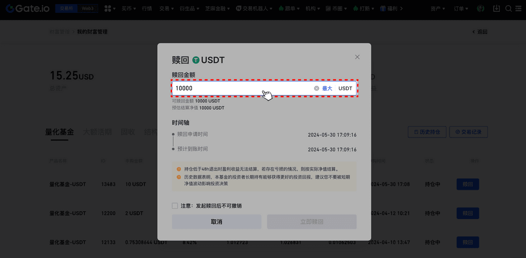 在Gate官网上,用户可以通过导航栏选择“赚币”进入量化基金页面,找到心仪的币种(如USDT)后点击“立即参与”,在弹窗中输入申购数量并确认,即可完成申购,申购成功后可前往持仓页面查看订单信息,若需查看申购记录和收益情况,可在“我的财富管理”页面进行查询,支持随时赎回,赎回金额为订单最大金额,发起赎回后不可撤销,赎回成功后实时到账,若触发风控上限则需人工审核,审核周期为T+1天,赎回后可在交易记录中查看收益,所有操作流程简单明了,确保用户能够便捷地进行量化基金的投资与管理。