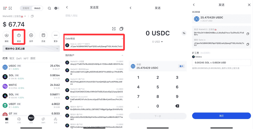 点击钱包首页【发送】,选择发送代币。进入发送页后,选择【Gate地址】,填入发送数量,确认代币数额、钱包地址、Gas费无误后点击【确定】即可转账至Gate账户。