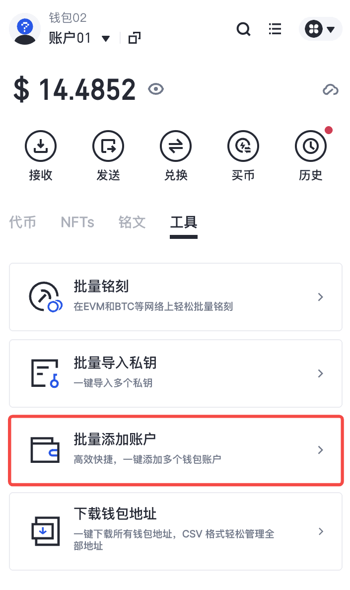 目前Gate Web3钱包已支持批量添加钱包账户、批量导入私钥的功能,您可以通过查看以下步骤进行操作: