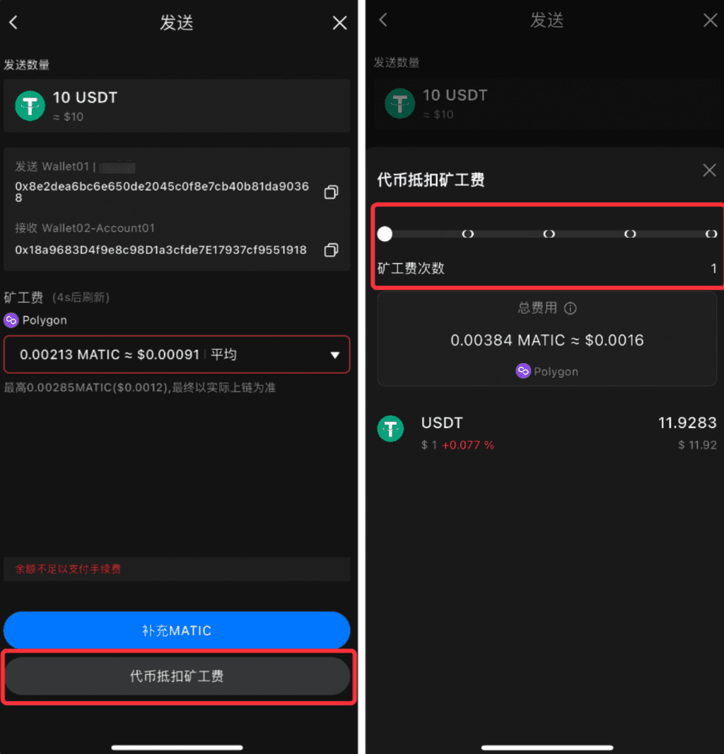 当您在发送代币时,如出现手续费不足的情况,在发送界面中会出现【补充xxx】【代币抵扣矿工费】的选项。点击