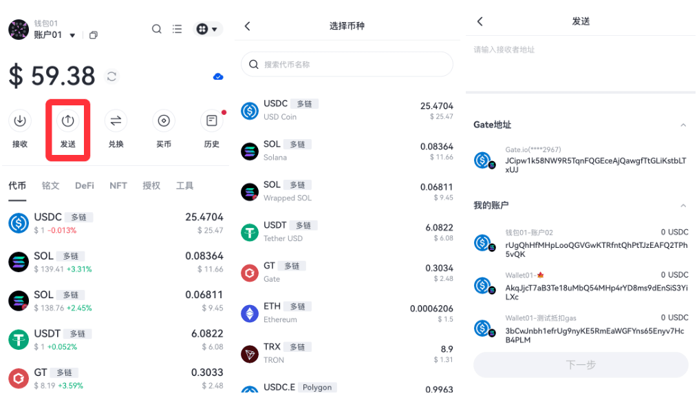 点击插件界面中的“发送”按钮,选择转账代币,输入接收者地址。填入转账代币数额,确认发送数额、钱包地址、矿工费无误后点击【确定】即可。