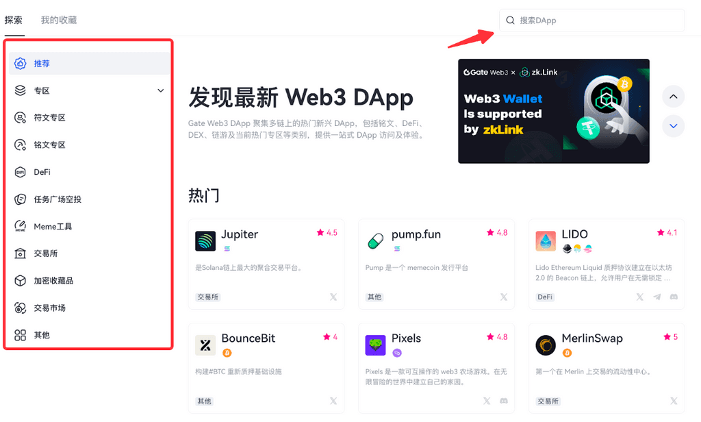 在 Gate Web3 平台上,用户可以轻松探索各类去中心化应用(DApp),通过网页端、钱包插件和移动应用等多种方式访问,网页端用户只需进入 Gate Web3 页面,点击菜单栏中的 “DApp” 选项,即可进入 DApp 页面,支持通过搜索栏或类别查找感兴趣的 DApp,点击 DApp 图标可查看详情并直接使用,此外还可以将喜欢的 DApp 收藏,方便后续访问,移动应用用户在首页点击 “Web3” 进入 Web3 界面后,同样可以通过 “发现” 功能探索 DApp,整体操作简单直观,适合所有用户,尽情享受去中心化应用带来的便利与创新。
