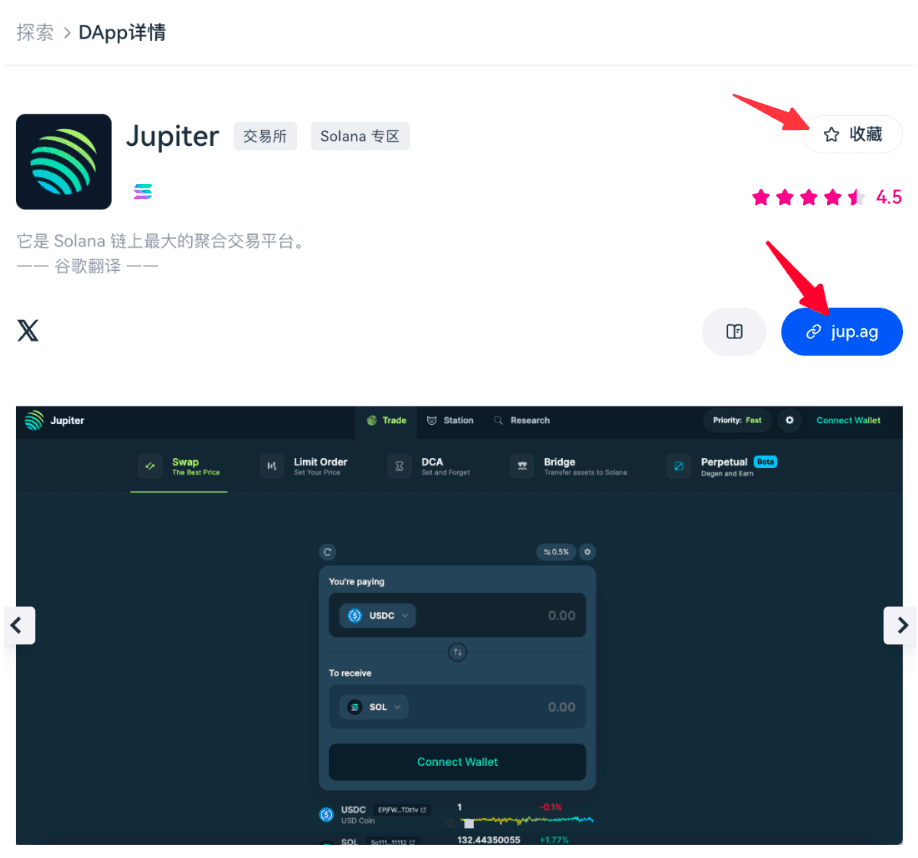点击您感兴趣的 DApp 图标可进入 DApp 详情页,点击详情页面中蓝色按钮,可直接进入、使用该 DApp。也可点击页面中的 “收藏” 按钮,可收藏该 DApp,在首页的“我的收藏”可查看您收藏的 DApp。