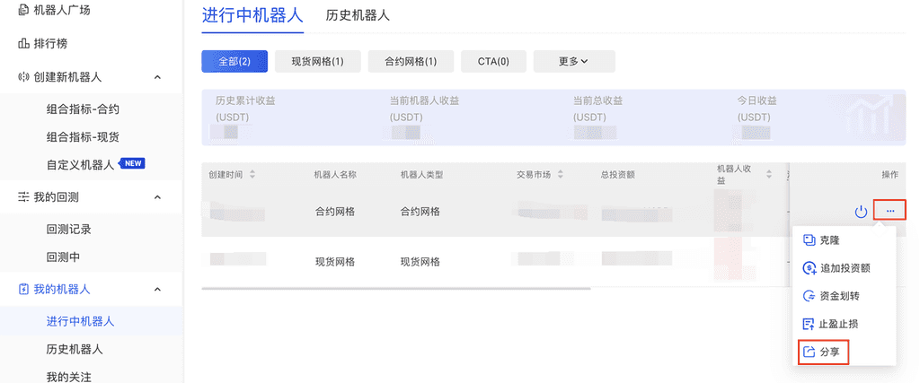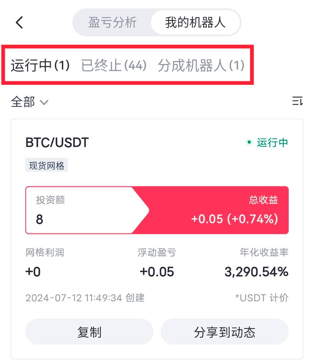 进入机器人主页 - 点击 “我的机器人”即可查看运行中/已终止/分成机器人。