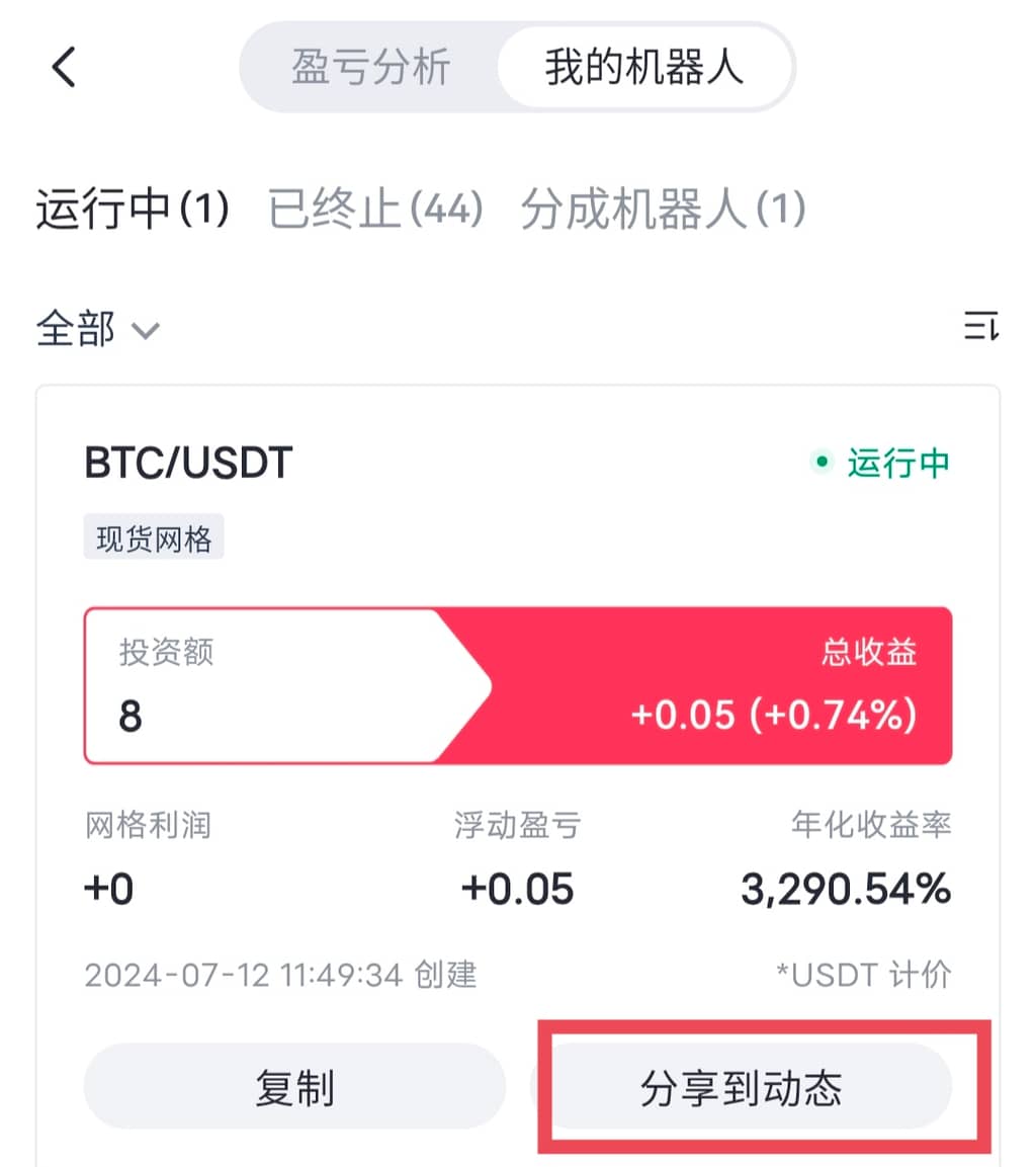 进入机器人主页 - 点击 “我的机器人” - 选择“进行中/已终止/分成机器人” - 点击 “分享到动态” 即可分享自己创建/复制的机器人。