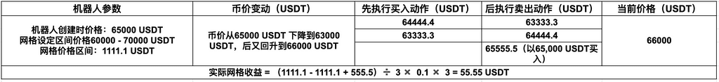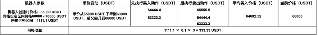 用户A在BTC价格是65,000 USDT时,以65,000 USDT的成交价开了一个价格区间为59,000 - 80,000 USDT的现货网格机器人,开了60个等差网格。若BTC价格从65,000 USDT跌落到62,000USDT再上涨到68,000 USDT时,从理论上来讲,此时网格整体是盈利的。但由于网格执行过程中订单成交是随机的,所以可能出现某些交易以低价卖出高价买入的代币的情况,例如以64,694 USDT买入的BTC最后以63,983 USDT的价格卖出,出现短时的网格盈利为负的情况,此时网格显示的总收益就会出现负的情况。但低价买入没有卖出的代币也会带来浮盈,因此最终的网格收益不会减少,短时的网格收益不影响整体网格盈利。