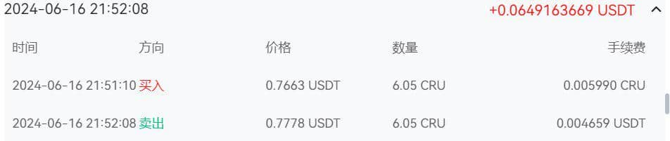 用户B开了一个价格区间为0.2 - 2.5 USDT的CRU现货网格机器人,开了200个等差网格,单格买入6.05个CRU。根据网格参数,单格价差应该为0.01155779 USDT,单格收益应该为0.06992463 USDT。但在实际的交易过程中,由于滑点和交易手续费的存在,会出现单格价差小于理论值的情况。