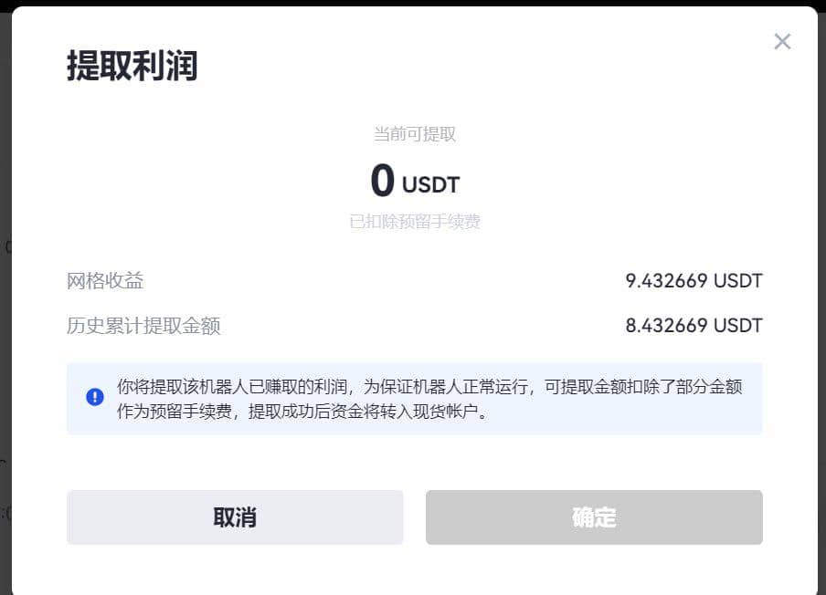 由于目前大部分市场最小下单量为1USDT,所以这里会保留1USDT 去下单购买base作为手续费抵扣。此时,用户B将无法按照网格界面显示的网格收益金额提取网格利润。