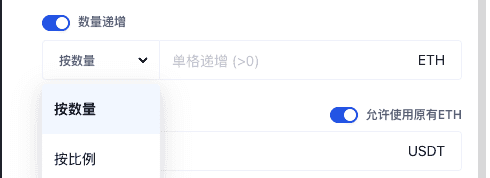 数量递增: 数量递增默认是关闭状态,在开启时,您可以选择按照数量或按照比例来增加每个网格的买卖数量,如图所示: