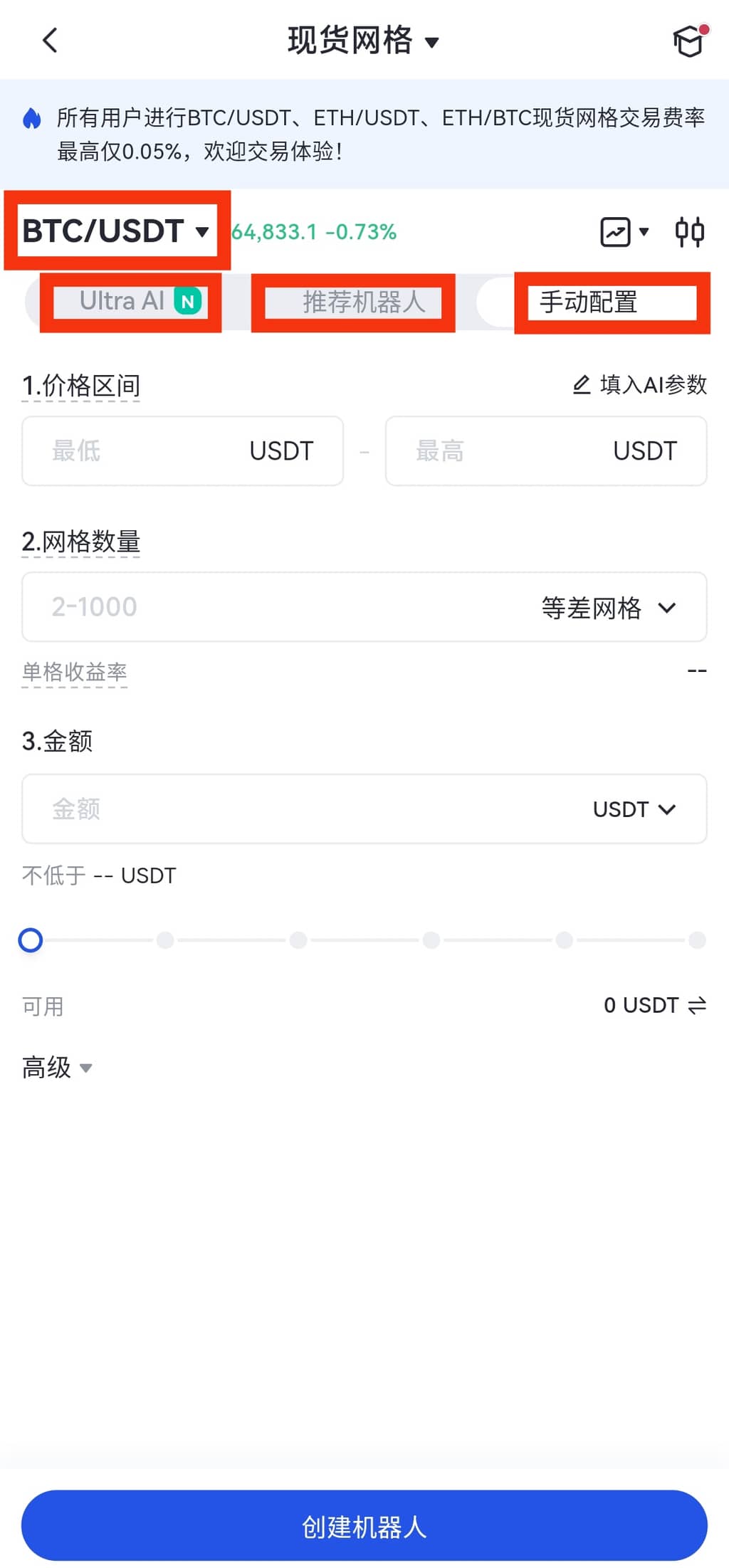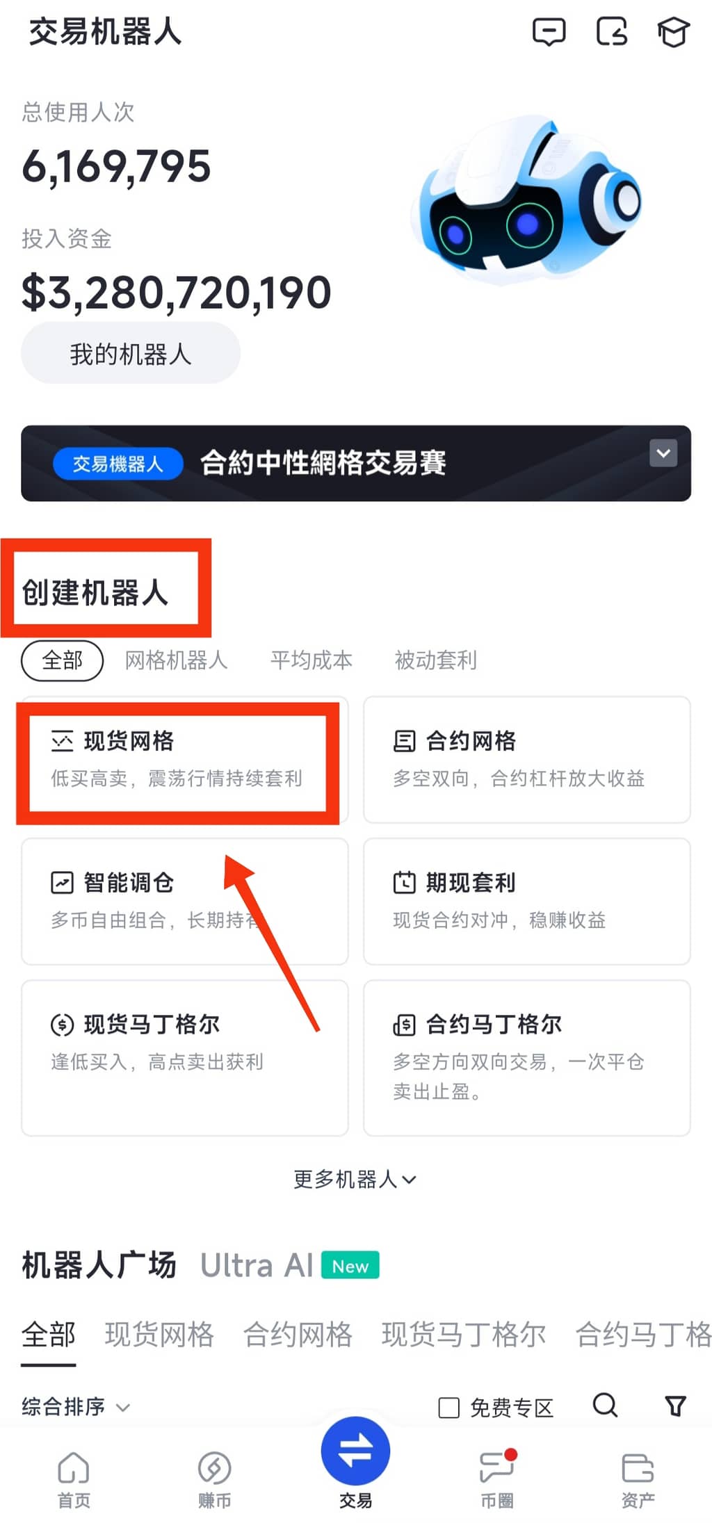 交易机器人 - 创建机器人 - 现货网格 - 选择交易对 - Ultra AI/ 推荐机器人/手动配置网格 - 创建